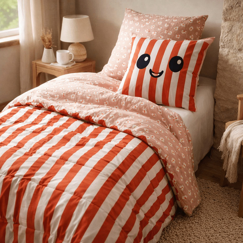 Propriétés : doux – léger – impressions différentes sur recto/verso taie et couette imprimée : rayures recto/pop corn verso