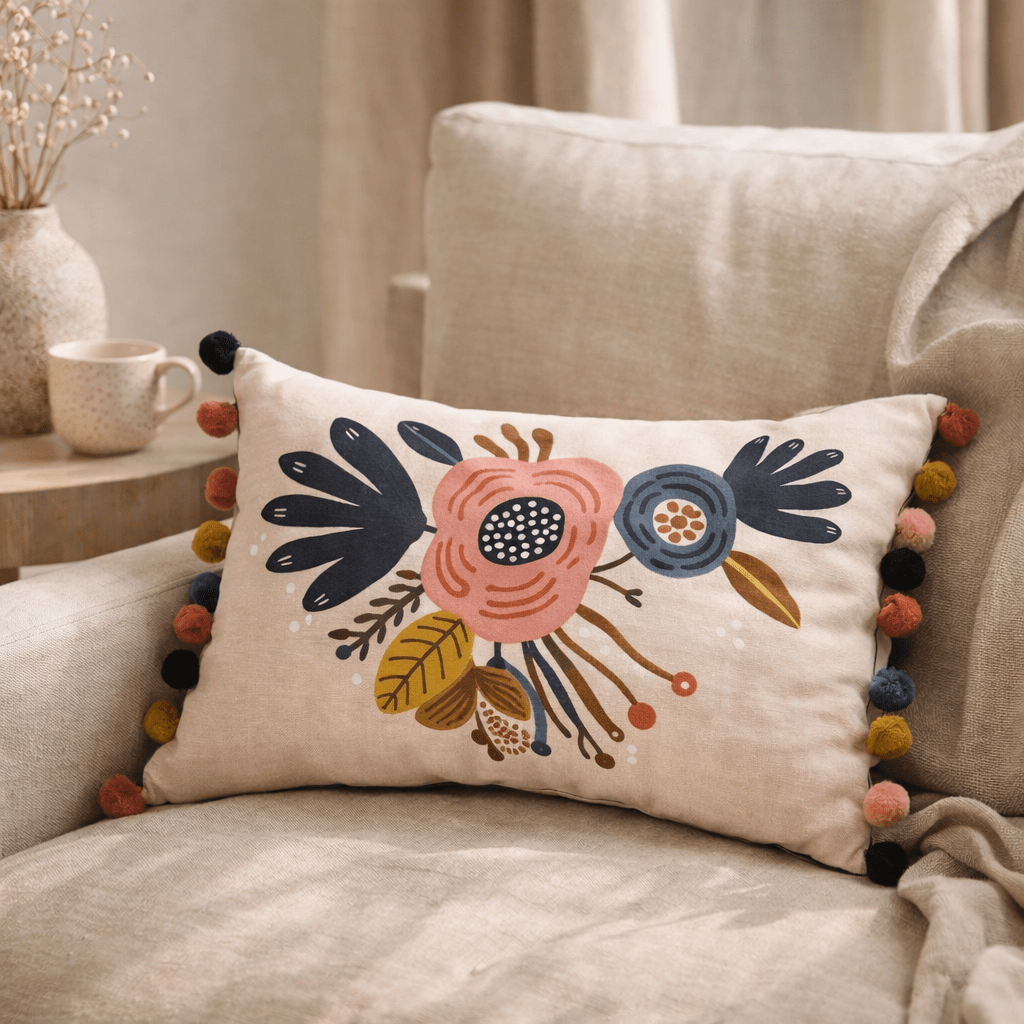 Coussin déhoussable avec pompons CHAMPETRE