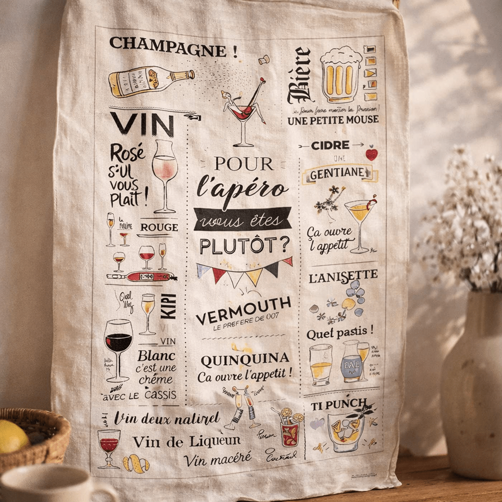 Le torchon Verres et apéros de Winkler est un véritable coup de cœur pour nous ! Il rappelle ces moments chaleureux passés entre amis ou en famille autour d’un apéro estival, et apporte une touche colorée et joyeuse à votre cuisine. Ses motifs soigneusement imprimés sont un véritable hommage à la convivialité. Et pour couronner le tout, il est 100% coton, doux et absorbant, idéal pour prendre soin de votre vaisselle. Astuce : pourquoi ne pas l’utiliser comme une petite nappe pour vos plateaux apéritifs ? Il fera sensation !