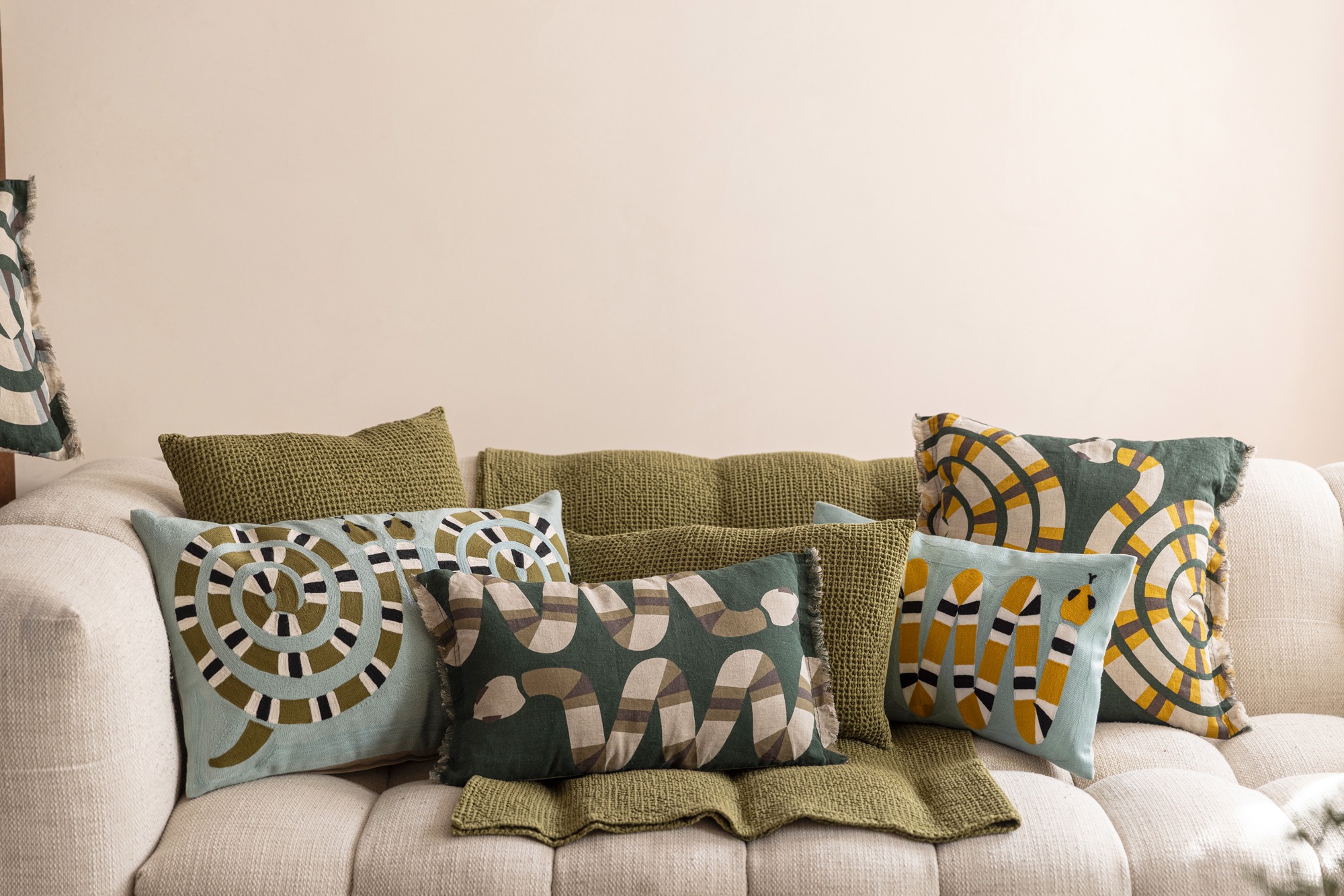 El cojín Zeff Yoka es como un buen libro, nunca te cansas de descubrirlo. Su atrevido y moderno estampado de serpientes aporta un toque de originalidad a tu hogar. Es tan cómodo y suave que convierte cada momento de relax en una experiencia acogedora. ¿Nuestro consejo? Úsalo para una siesta reparadora en tu sofá o para dar un toque de color a tu cama. ¡Te encantará!